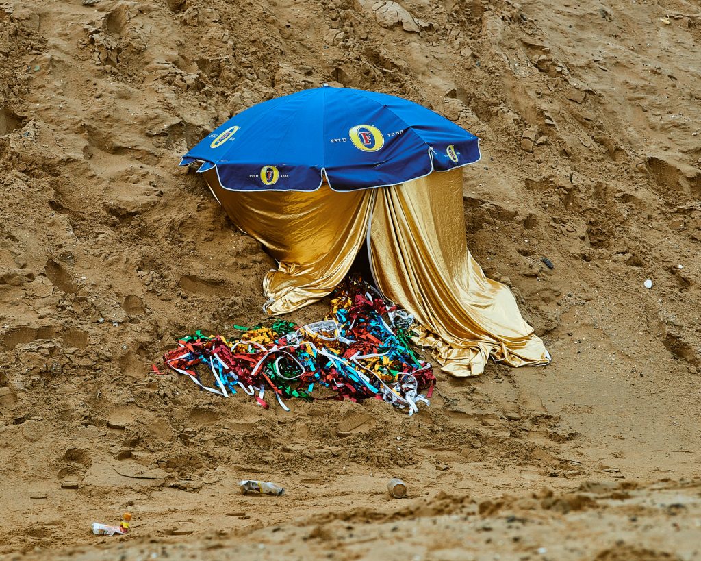 Matt Rowe’s latest installation for the Allotment project space transforms 9 Love Lane, Margate, into a site of spectral collapse. A Fluid mass of car lot bunting, seaside windmills and gold lamé hang beneath a reclaimed pub parasol.Rowe’s installation echoes the onslaught of winter and the annual demise of the English seaside resort.