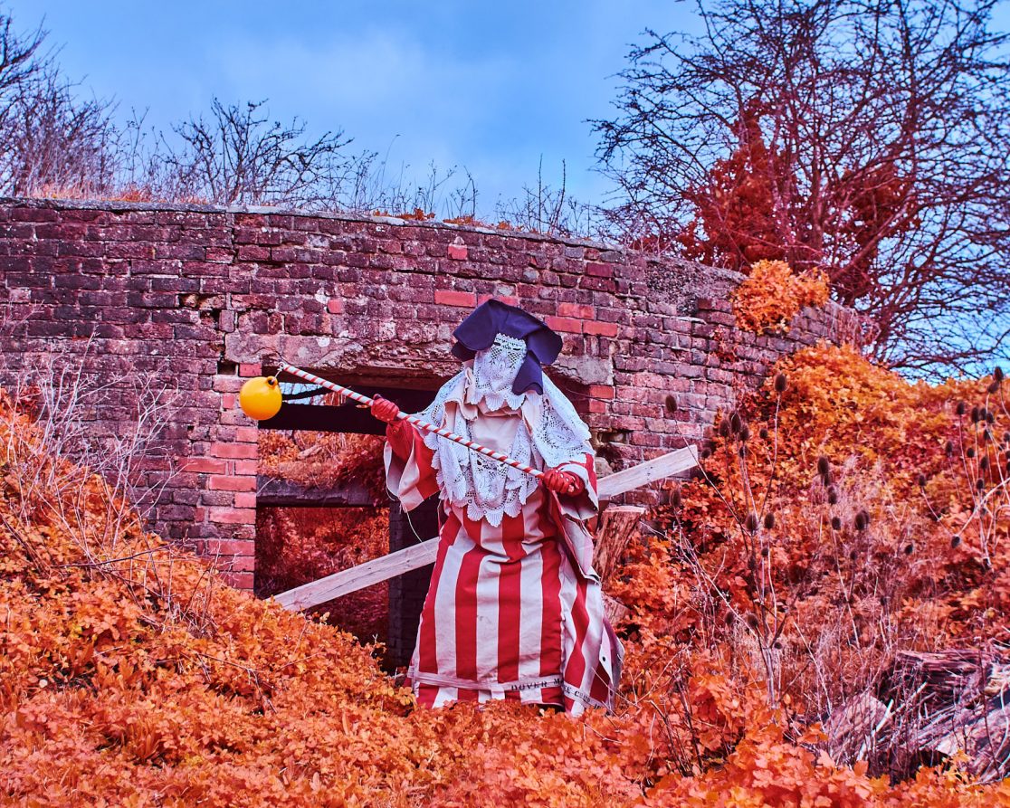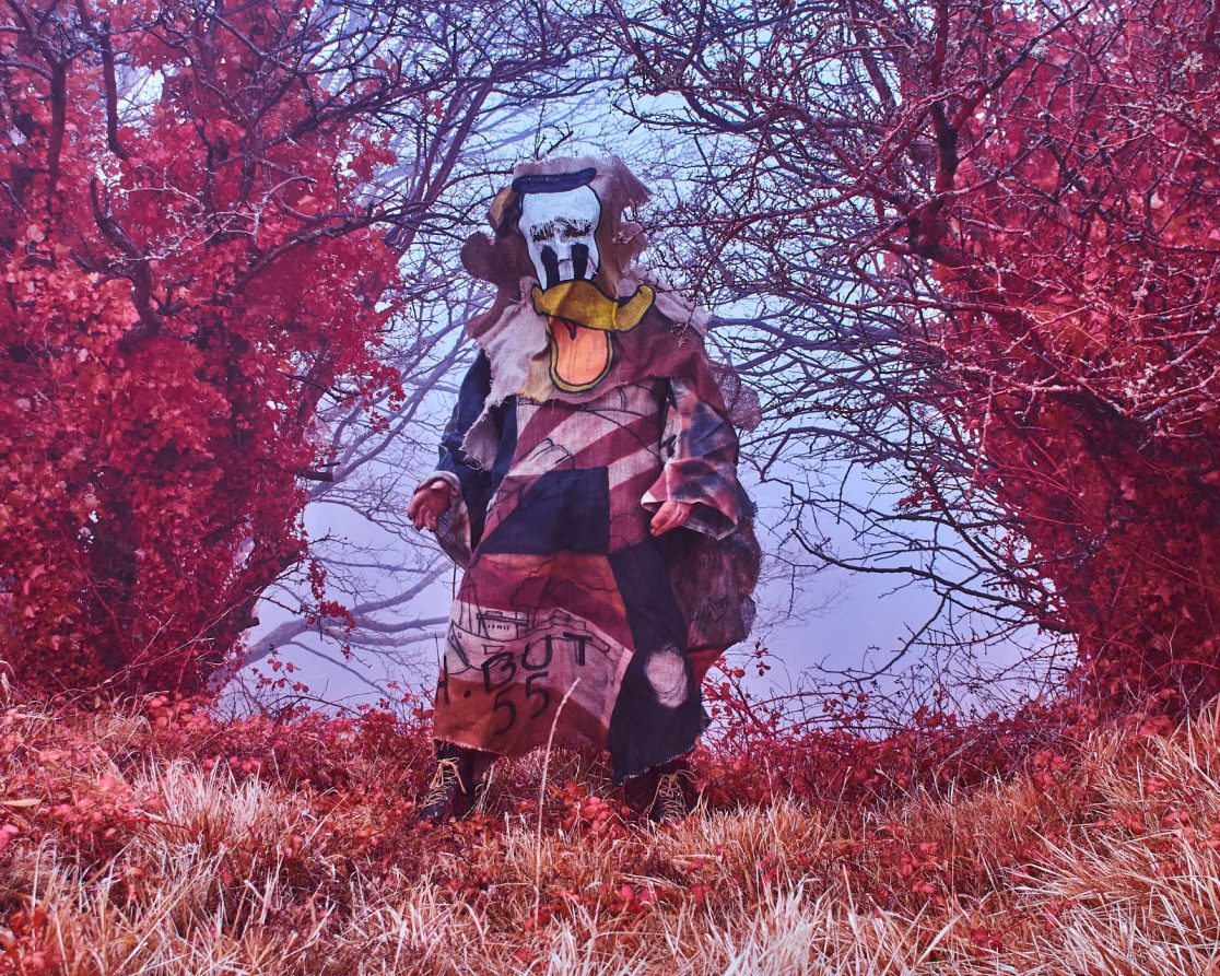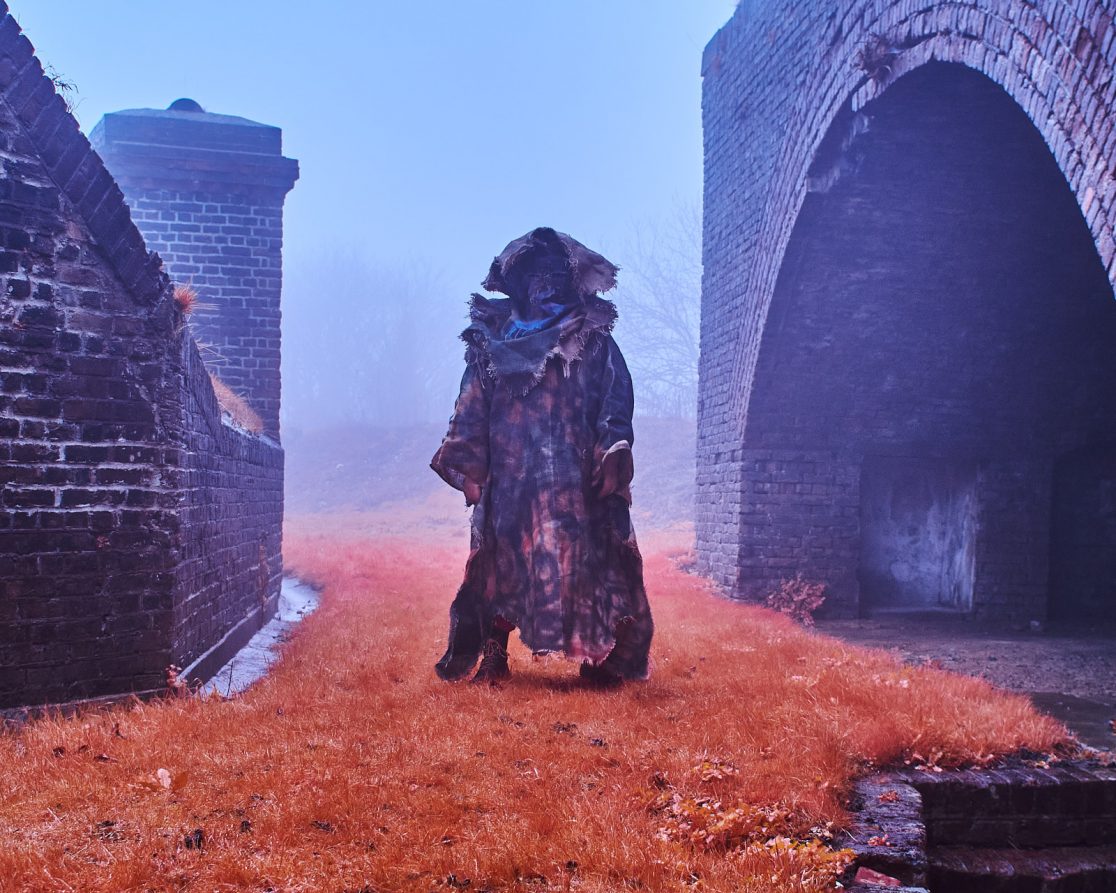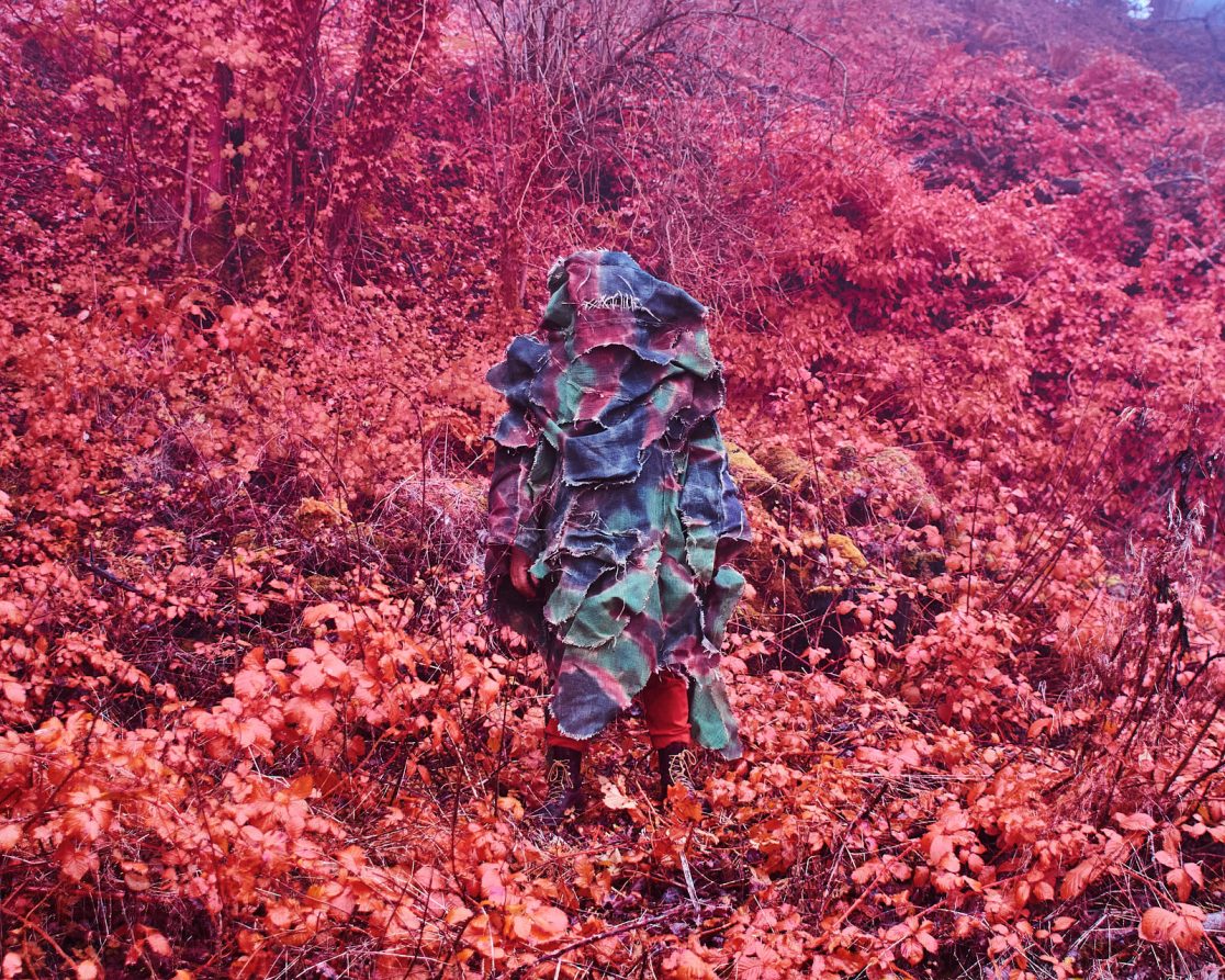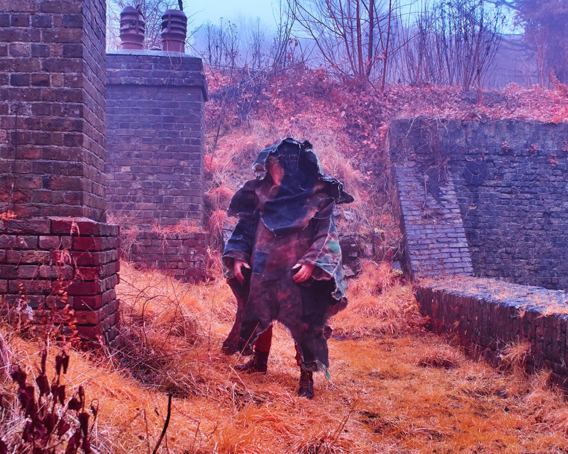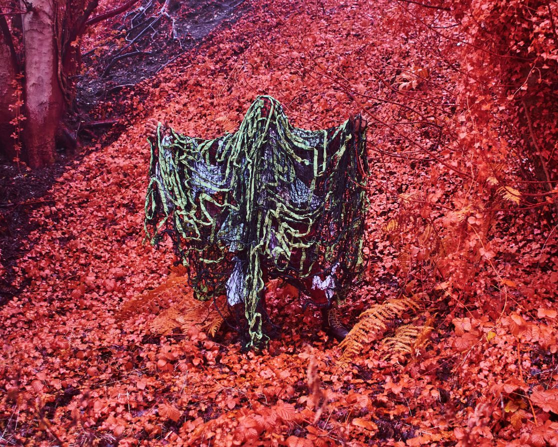 Alongside his photographic response, he has constructed a selection of ‘ghillie suits’, inspired by the Surrealist painter, Roland Penrose and his work on camouflage in WWII. Rowe’s ghillie suits absorb the signs, symbols and graffiti at Fort Burgoyne into a wearable topography